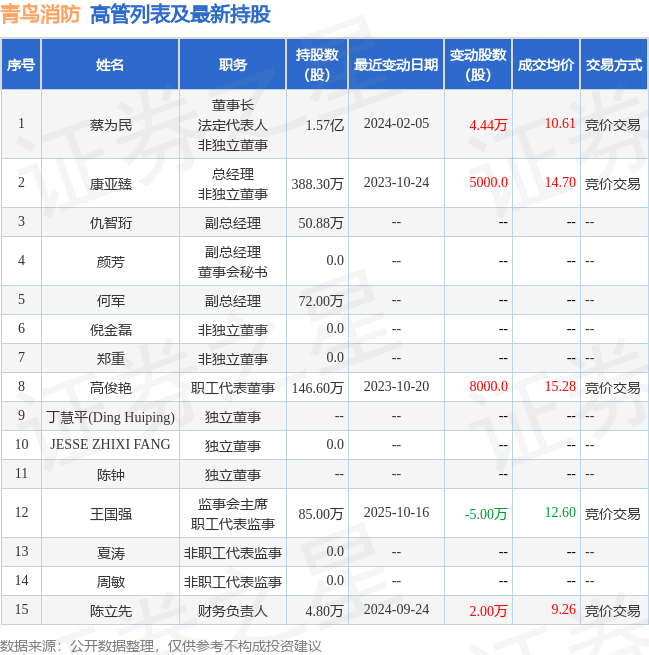 青鸟消防近半年内的董监高及核心技术人员增减持详情如下:
