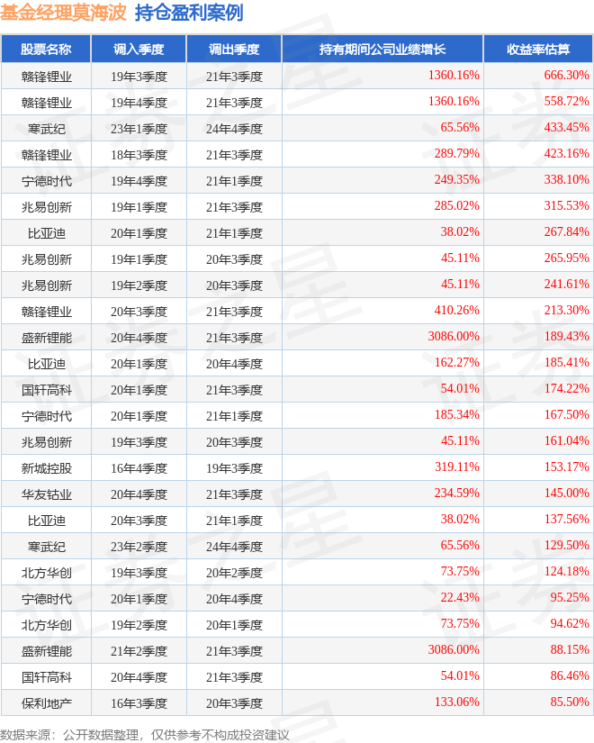 莫海波管理的万家品质生活混合A基金在19年3季度买入赣锋锂业,在持有2年又0个季度后在21年3季度卖出。持有期间的估算收益率为666.3%,持有期间赣锋锂业在2019年到2021年的年报归属净利润增幅达1360.16%。