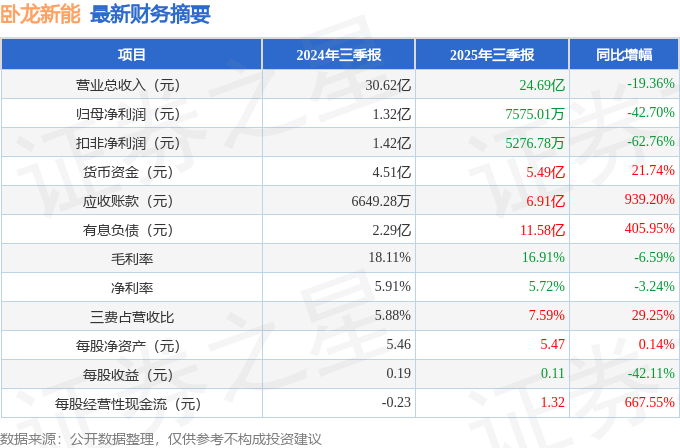 据证券之星公开数据整理,近期卧龙新能(600173)发布2025年三季报。截至本报告期末,公司营业总收入24.69亿元,同比下降19.36%,归母净利润7575.01万元,同比下降42.7%。按单季度数据看,第三季度营业总收入3.2亿元,同比下降78.49%,第三季度归母净利润-579.7万元,同比下降128.23%。本报告期卧龙新能应收账款上升,应收账款同比增幅达939.2%。