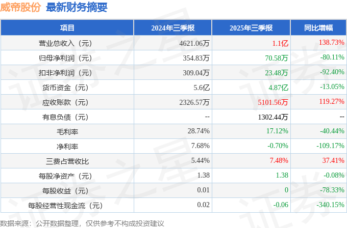 据证券之星公开数据整理,近期威帝股份(603023)发布2025年三季报。截至本报告期末,公司营业总收入1.1亿元,同比上升138.73%,归母净利润70.58万元,同比下降80.11%。按单季度数据看,第三季度营业总收入3636.55万元,同比上升238.17%,第三季度归母净利润15.37万元,同比上升110.79%。本报告期威帝股份应收账款上升,应收账款同比增幅达119.27%。