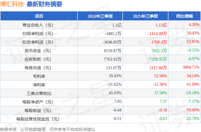 据证券之星公开数据整理,近期博汇科技(688004)发布2025年三季报。截至本报告期末,公司营业总收入1.15亿元,同比上升4.28%,归母净利润-1414.08万元,同比上升59.43%。按单季度数据看,第三季度营业总收入6374.42万元,同比上升18.75%,第三季度归母净利润276.14万元,同比上升121.94%。本报告期博汇科技盈利能力上升,毛利率同比增幅32.06%,净利率同比增幅61.09%。