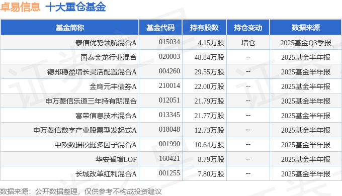 持有卓易信息最多的基金为泰信优势领航混合A,目前规模为0.18亿元,最新净值1.091(10月24日),较上一交易日上涨3.92%,近一年上涨28.1%。该基金现任基金经理为吴秉韬。