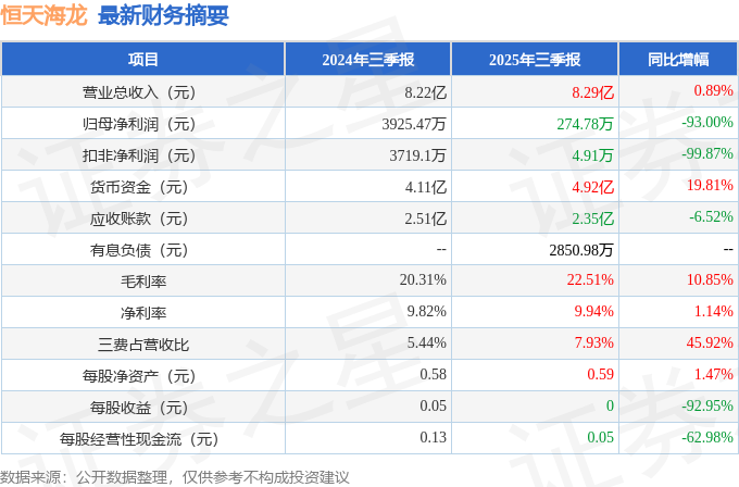 据证券之星公开数据整理,近期恒天海龙(000677)发布2025年三季报。截至本报告期末,公司营业总收入8.29亿元,同比上升0.89%,归母净利润274.78万元,同比下降93.0%。按单季度数据看,第三季度营业总收入2.53亿元,同比下降7.67%,第三季度归母净利润-2781.74万元,同比下降312.61%。本报告期恒天海龙盈利能力上升,毛利率同比增幅10.85%,净利率同比增幅1.14%。