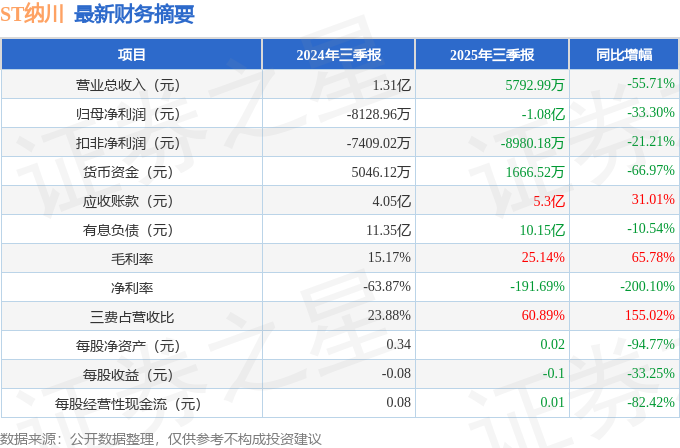 据证券之星公开数据整理,近期ST纳川(300198)发布2025年三季报。截至本报告期末,公司营业总收入5792.99万元,同比下降55.71%,归母净利润-1.08亿元,同比下降33.3%。按单季度数据看,第三季度营业总收入2239.21万元,同比下降31.54%,第三季度归母净利润-3169.47万元,同比上升25.72%。本报告期ST纳川三费占比上升明显,财务费用、销售费用和管理费用总和占总营收同比增幅达155.02%。