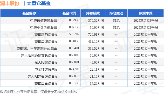 持有润丰股份最多的基金为中庚价值先锋股票,目前规模为32.36亿元,最新净值1.0744(10月24日),较上一交易日下跌0.48%,近一年上涨13.72%。该基金现任基金经理为陈涛。