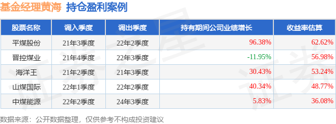 黄海管理的万家精选混合A基金在21年4季度买入晋控煤业,在持有3个季度后在22年3季度卖出。持有期间的估算收益率为56.98%,持有期间晋控煤业在2021年到2022年的年报营业总收入降幅为11.95%。