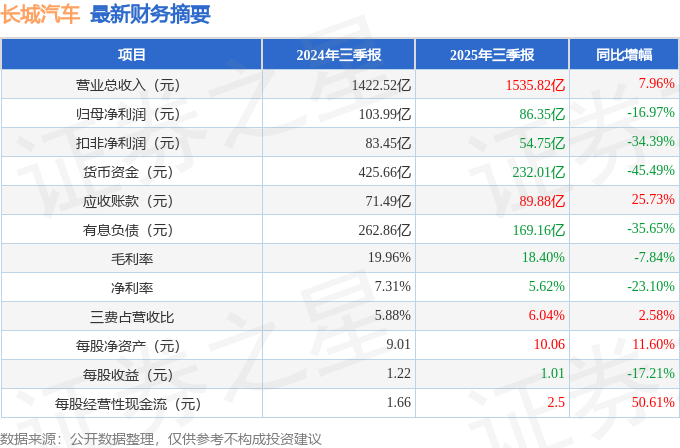 据证券之星公开数据整理,近期长城汽车(601633)发布2025年三季报。截至本报告期末,公司营业总收入1535.82亿元,同比上升7.96%,归母净利润86.35亿元,同比下降16.97%。按单季度数据看,第三季度营业总收入612.47亿元,同比上升20.51%,第三季度归母净利润22.98亿元,同比下降31.23%。本报告期长城汽车公司应收账款体量较大,当期应收账款占最新年报归母净利润比达70.81%。