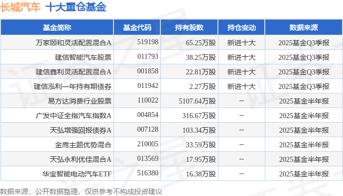 持有长城汽车最多的基金为万家颐和灵活配置混合A,目前规模为3.1亿元,最新净值1.6303(10月24日),较上一交易日下跌0.2%,近一年上涨2.07%。该基金现任基金经理为章恒。