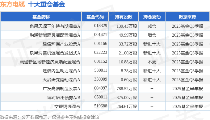 持有东方电缆最多的基金为泉果思源三年持有期混合A,目前规模为27.25亿元,最新净值1.2547(10月24日),较上一交易日上涨1.78%,近一年上涨32.12%。该基金现任基金经理为刚登峰。