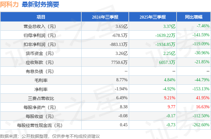 据证券之星公开数据整理,近期阿科力(603722)发布2025年三季报。根据财报显示,阿科力净利润同比下降141.59%。截至本报告期末,公司营业总收入3.37亿元,同比下降7.46%,归母净利润-1639.22万元,同比下降141.59%。按单季度数据看,第三季度营业总收入1.23亿元,同比上升0.79%,第三季度归母净利润-1108.1万元,同比下降26.38%。
