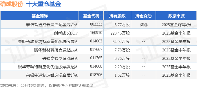 持有确成股份最多的基金为泰信智选成长灵活配置混合A,目前规模为0.27亿元,最新净值0.7973(10月24日),较上一交易日上涨0.13%,近一年下跌17.01%。该基金现任基金经理为钱栋彪。