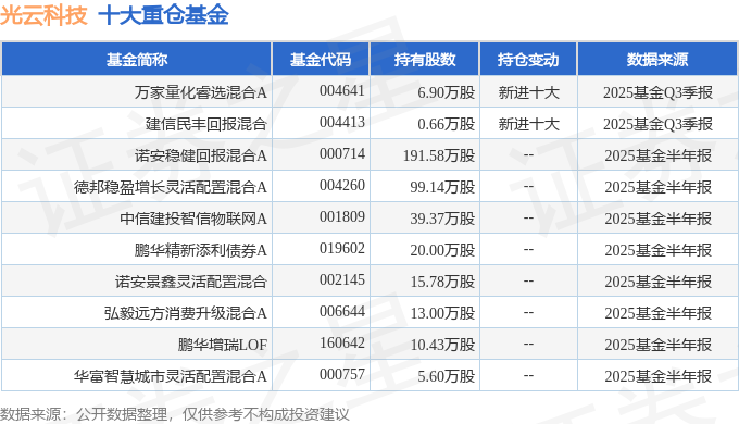 持有光云科技最多的基金为万家量化睿选混合A,目前规模为0.82亿元,最新净值1.6014(10月24日),较上一交易日上涨1.14%,近一年上涨37.33%。该基金现任基金经理为乔亮。