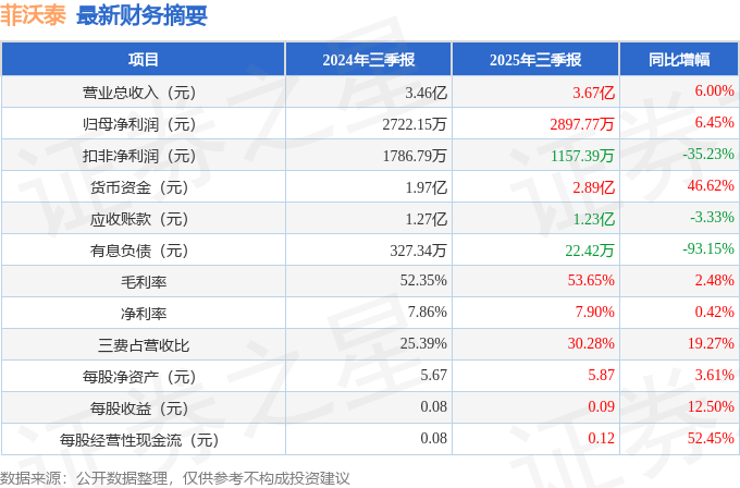 据证券之星公开数据整理,近期菲沃泰(688371)发布2025年三季报。截至本报告期末,公司营业总收入3.67亿元,同比上升6.0%,归母净利润2897.77万元,同比上升6.45%。按单季度数据看,第三季度营业总收入1.38亿元,同比上升4.47%,第三季度归母净利润1226.42万元,同比上升4.74%。本报告期菲沃泰盈利能力上升,毛利率同比增幅2.48%,净利率同比增幅0.42%。