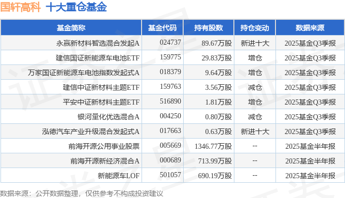 持有国轩高科最多的基金为永赢新材料智选混合发起A,目前规模为0.72亿元,最新净值1.1579(10月24日),较上一交易日上涨4.13%。该基金现任基金经理为欧子辰。