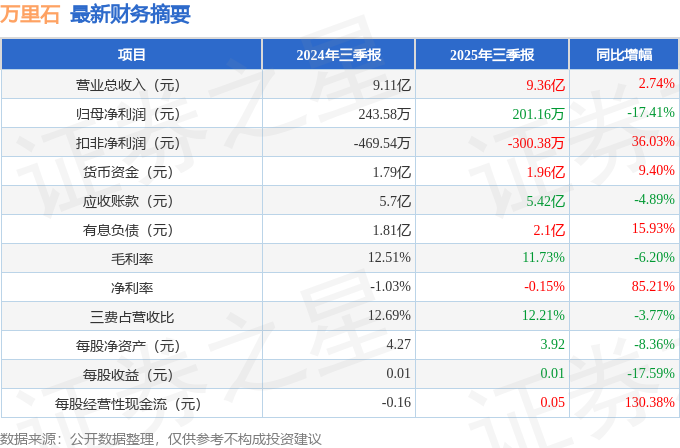 据证券之星公开数据整理,近期万里石(002785)发布2025年三季报。截至本报告期末,公司营业总收入9.36亿元,同比上升2.74%,归母净利润201.16万元,同比下降17.41%。按单季度数据看,第三季度营业总收入3.33亿元,同比上升28.77%,第三季度归母净利润-321.38万元,同比下降71.58%。本报告期万里石公司应收账款体量较大,当期应收账款占最新年报营业总收入比达42.44%。