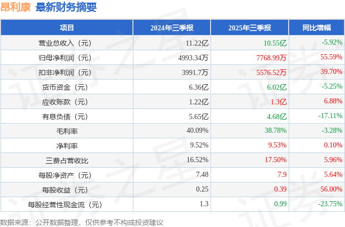 据证券之星公开数据整理,近期昂利康(002940)发布2025年三季报。根据财报显示,昂利康净利润同比增长55.59%。截至本报告期末,公司营业总收入10.55亿元,同比下降5.92%,归母净利润7768.99万元,同比上升55.59%。按单季度数据看,第三季度营业总收入3.31亿元,同比上升20.67%,第三季度归母净利润1176.47万元,同比上升164.77%。