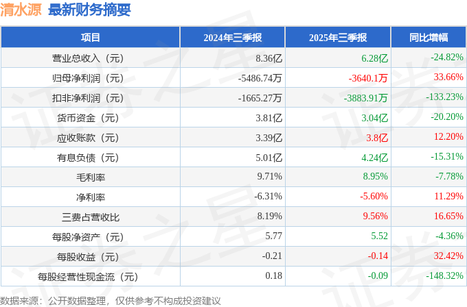 据证券之星公开数据整理,近期清水源(300437)发布2025年三季报。根据财报显示,清水源亏损收窄。截至本报告期末,公司营业总收入6.28亿元,同比下降24.82%,归母净利润-3640.1万元,同比上升33.66%。按单季度数据看,第三季度营业总收入2.12亿元,同比下降21.85%,第三季度归母净利润-1063.99万元,同比上升0.13%。