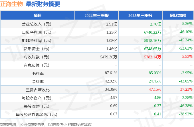 据证券之星公开数据整理,近期正海生物(300653)发布2025年三季报。截至本报告期末,公司营业总收入2.76亿元,同比下降5.36%,归母净利润6740.22万元,同比下降46.1%。按单季度数据看,第三季度营业总收入8787.71万元,同比下降5.84%,第三季度归母净利润2091.65万元,同比下降46.4%。本报告期正海生物三费占比上升明显,财务费用、销售费用和管理费用总和占总营收同比增幅达37.23%。