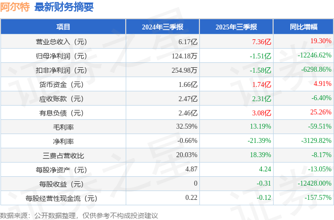 据证券之星公开数据整理,近期阿尔特(300825)发布2025年三季报。根据财报显示,阿尔特增收不增利。截至本报告期末,公司营业总收入7.36亿元,同比上升19.3%,归母净利润-1.51亿元,同比下降12246.62%。按单季度数据看,第三季度营业总收入2.13亿元,同比下降4.9%,第三季度归母净利润-9263.78万元,同比下降643.97%。