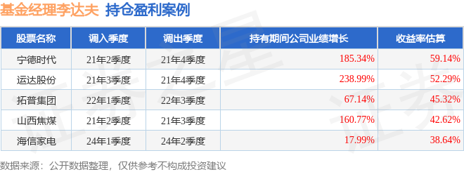 李达夫管理的国投瑞银景气行业混合基金在21年2季度买入宁德时代,在持有2个季度后在21年4季度卖出。持有期间的估算收益率为59.14%,持有期间宁德时代在2020年到2021年的年报归属净利润增幅达185.34%。