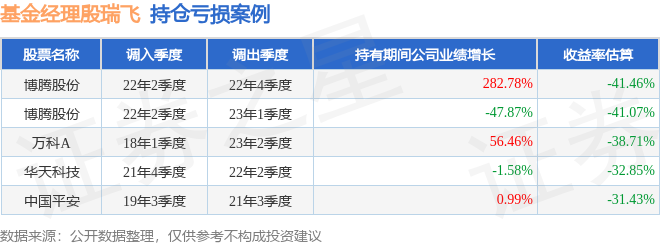 殷瑞飞管理的国投瑞银安睿混合A基金在22年2季度买入博腾股份,在持有2个季度后在22年4季度卖出。持有期间的估算收益率为-41.46%,持有期间博腾股份在2021年到2022年的年报归属净利润增幅达282.78%。