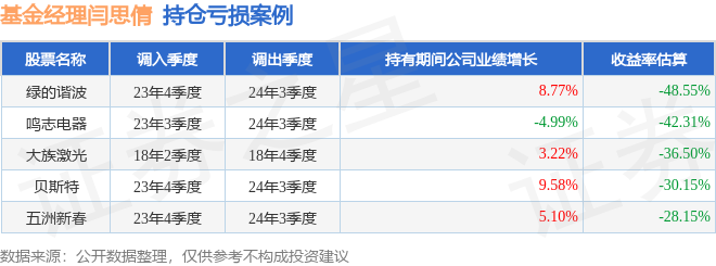 闫思倩管理的鹏华沪深港新兴成长混合A基金在23年4季度买入绿的谐波,在持有3个季度后在24年3季度卖出。持有期间的估算收益率为-48.55%,持有期间绿的谐波在2023年到2024年的年报营业总收入增幅达8.77%。