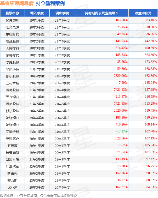 闫思倩管理的工银新能源汽车混合A基金在19年1季度买入亿纬锂能,在持有2年又3个季度后在21年4季度卖出。持有期间的估算收益率为1083.1%,持有期间亿纬锂能在2019年到2021年的年报营业总收入增幅达163.58%。