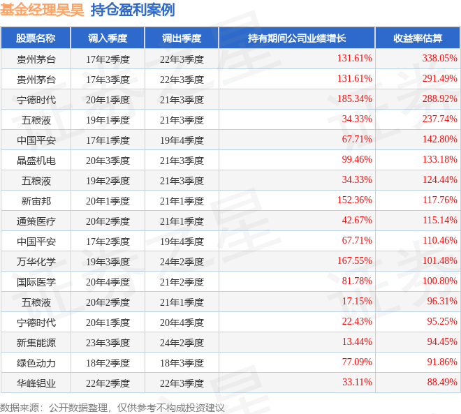 吴昊管理的中信保诚盛世蓝筹混合基金在17年2季度买入贵州茅台,在持有5年又1个季度后在22年3季度卖出。持有期间的估算收益率为338.05%,持有期间贵州茅台在2017年到2022年的年报归属净利润增幅达131.61%。