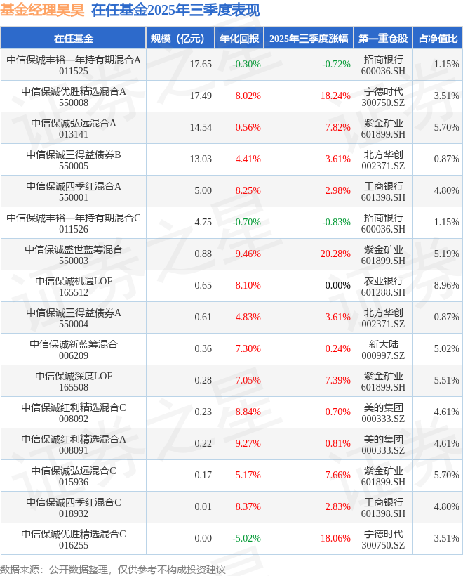 证券之星消息,截止2025年三季度末,基金经理吴昊旗下共管理16只基金,本季度表现最佳的为中信保诚盛世蓝筹混合(550003),季度净值涨20.28%。