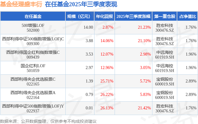证券之星消息,截止2025年三季度末,基金经理盛丰衍旗下共管理7只基金,本季度表现最佳的为西部利得中证500指数增强(LOF)Y(022937),季度净值涨21.42%。