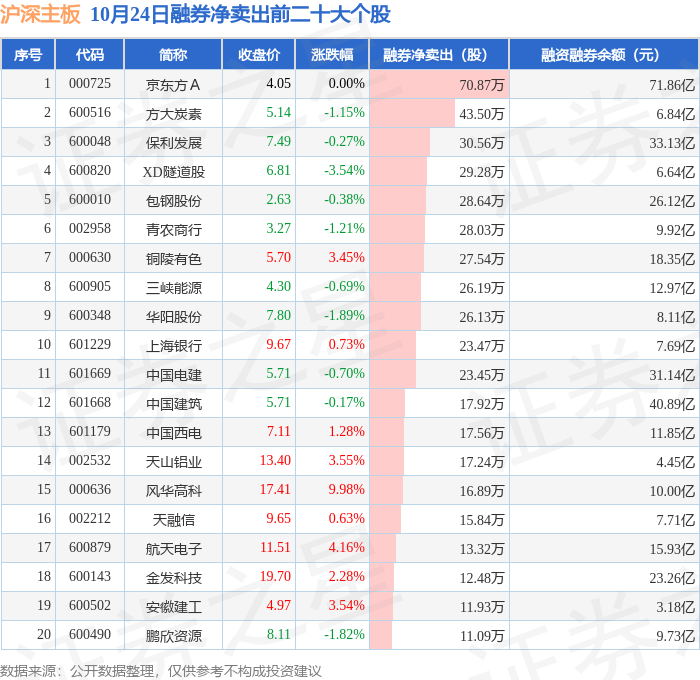 沪深主板融券净卖出前三分别为:京东方A(000725)融券净卖出70.87万股、方大炭素(600516)融券净卖出43.5万股、保利发展(600048)融券净卖出30.56万股,前20具体见下表: