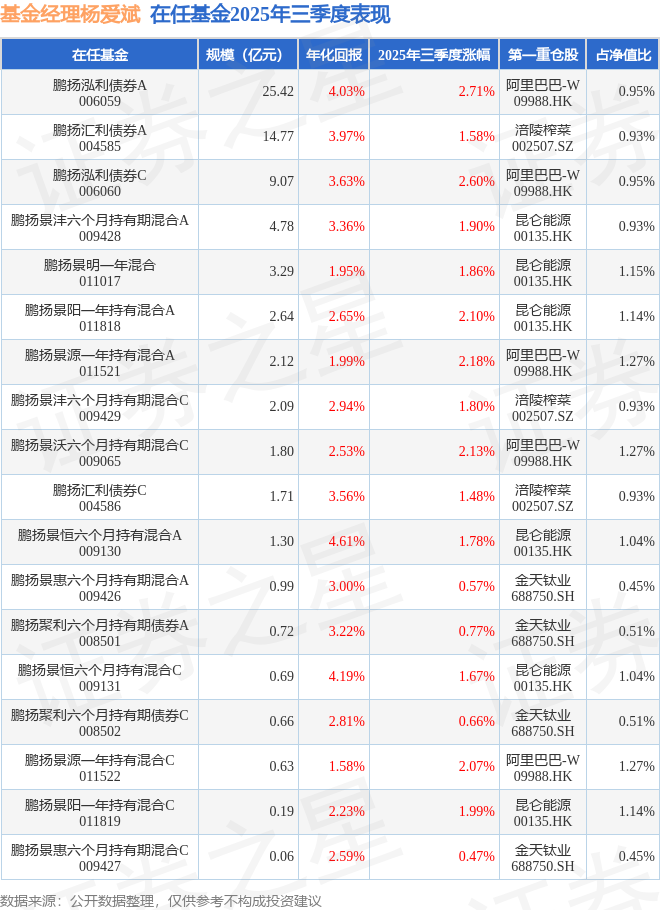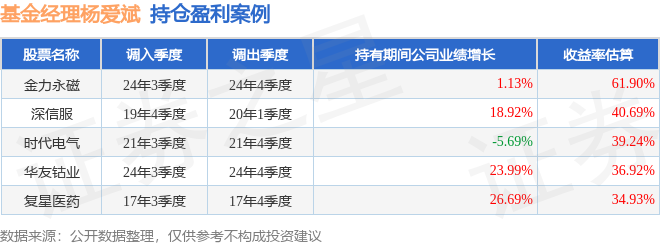 杨爱斌管理的鹏扬汇利债券A基金在24年3季度买入金力永磁,在持有1个季度后在24年4季度卖出。持有期间的估算收益率为61.9%,持有期间金力永磁在2023年到2024年的年报营业总收入增幅达1.13%。