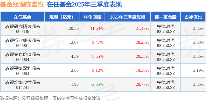 证券之星消息,截止2025年三季度末,基金经理陈富权旗下共管理5只基金,本季度表现最佳的为农银研究精选混合(000336),季度净值涨21.17%。