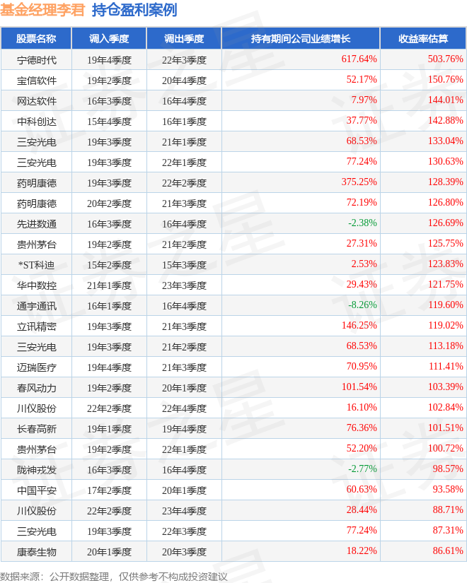 李君管理的鹏华创新动力LOF基金在19年4季度买入宁德时代,在持有2年又3个季度后在22年3季度卖出。持有期间的估算收益率为503.76%,持有期间宁德时代在2019年到2022年的年报营业总收入增幅达617.64%。