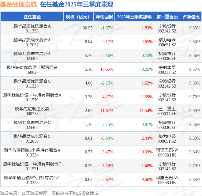 袁航在担任鹏华先进制造股票(000778)基金经理的任职期间累计任职回报236.0%,平均年化收益率为11.66%。期间重仓股调仓次数共有103次,其中盈利次数为61次,胜率为59.22%;翻倍级别收益有2次,翻倍率为1.94%。