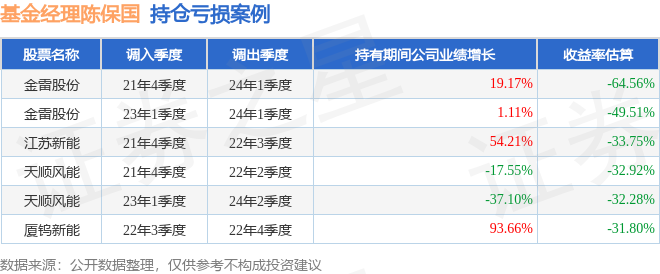 陈保国管理的西部利得碳中和混合发起A基金在21年4季度买入金雷股份,在持有2年又1个季度后在24年1季度卖出。持有期间的估算收益率为-64.56%,持有期间金雷股份在2021年到2024年的年报营业总收入增幅达19.17%。