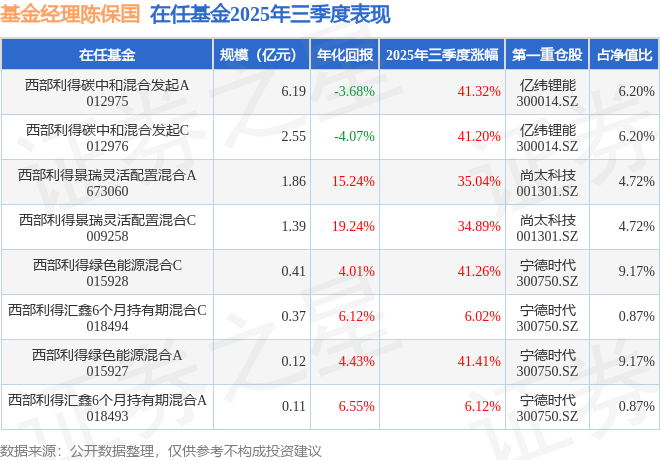 证券之星消息,截止2025年三季度末,基金经理陈保国旗下共管理8只基金,本季度表现最佳的为西部利得绿色能源混合A(015927),季度净值涨41.41%。