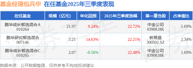证券之星消息,截止2025年三季度末,基金经理包兵华旗下共管理3只基金,本季度表现最佳的为鹏华成长智选混合A(010264),季度净值涨22.72%。