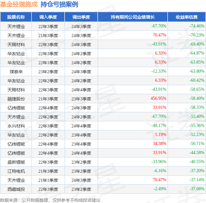 施成管理的国投瑞银产业转型一年持有混合A基金在22年3季度买入天齐锂业,在持有2年又0个季度后在24年3季度卖出。持有期间的估算收益率为-74.46%,持有期间天齐锂业在2022年到2024年的年报营业总收入降幅为67.7%。