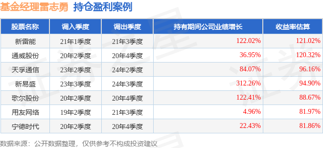 雷志勇管理的大摩科技领先混合A基金在21年1季度买入新雷能,在持有2个季度后在21年3季度卖出。持有期间的估算收益率为121.02%,持有期间新雷能在2020年到2021年的年报归属净利润增幅达122.02%。
