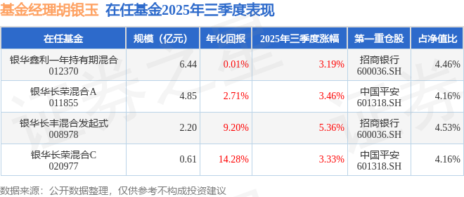 证券之星消息,截止2025年三季度末,基金经理胡银玉旗下共管理4只基金,本季度表现最佳的为银华长丰混合发起式(008978),季度净值涨5.36%。