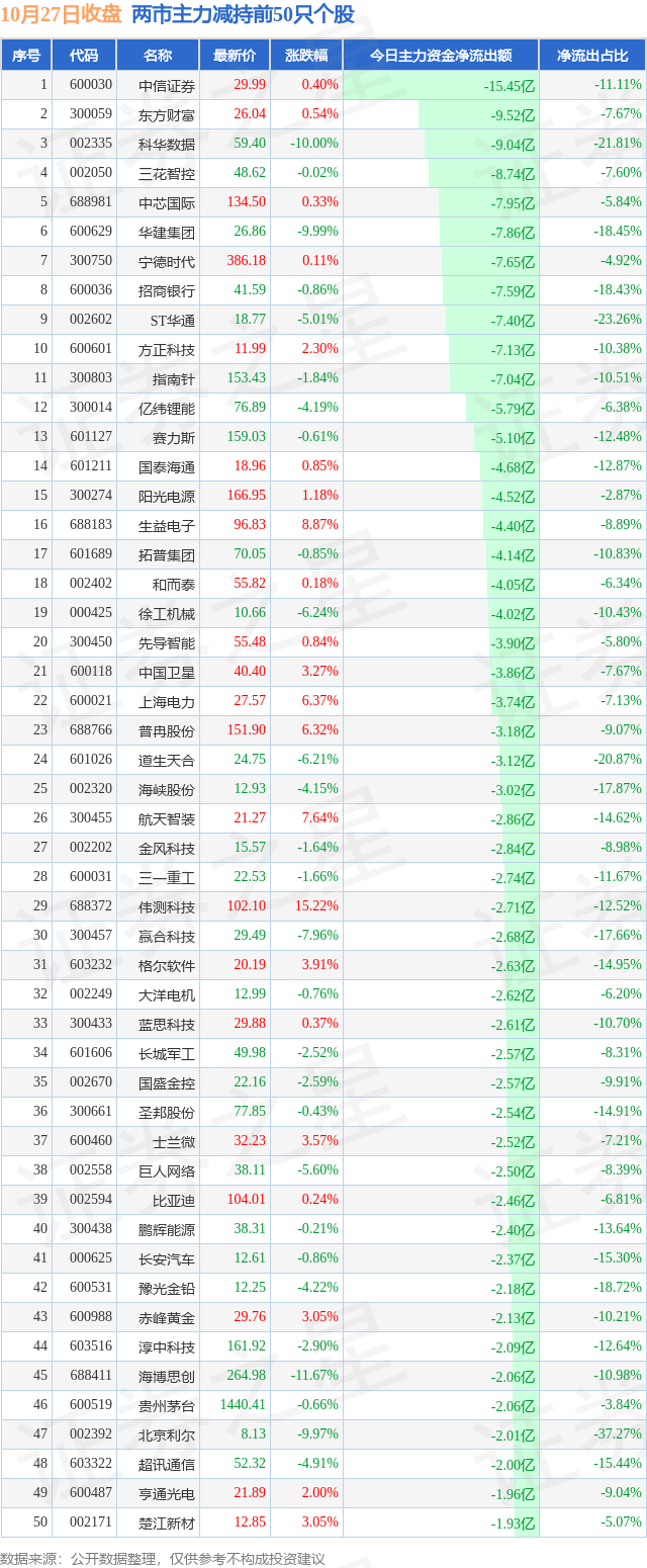 两市主力减持最多的前十只个股为: