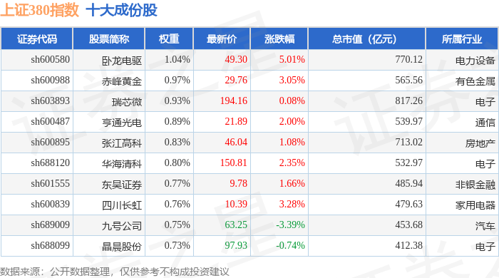证券之星消息,10月27日,上证380(000009)指数报收于6573.38点,涨1.22%,成交2273.79亿元,换手率1.92%。当日该指数成份股中,上涨的有244家,厦门钨业以10.0%的涨幅领涨,下跌的有123家,惠泰医疗以13.44%的跌幅领跌。