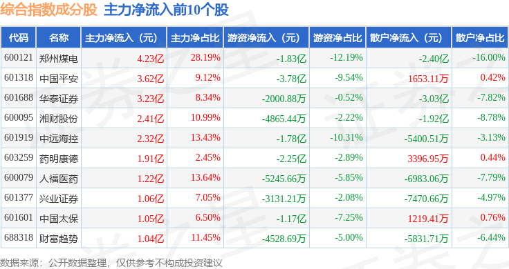 资金流向方面,综合指数(000008)成份股当日主力资金净流出合计24.62亿元,游资资金净流入合计9.8亿元,散户资金净流入合计14.83亿元。成份股资金流向详情见下表: