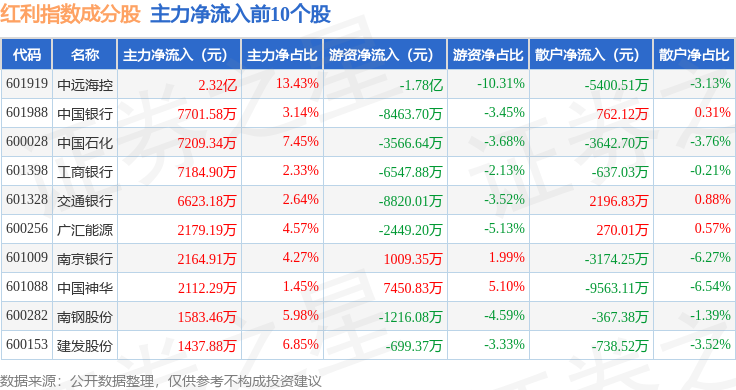 资金流向方面,红利指数(000015)成份股当日主力资金净流出合计3.95亿元,游资资金净流入合计4.0亿元,散户资金净流出合计482.07万元。成份股资金流向详情见下表: