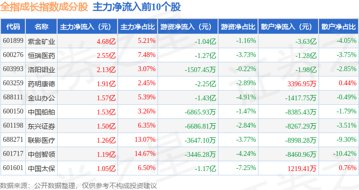 资金流向方面,全指成长(000057)指数成份股当日主力资金净流出合计13.09亿元,游资资金净流入合计2.93亿元,散户资金净流入合计10.16亿元。成份股资金流向详情见下表: