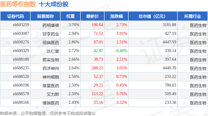 证券之星消息,10月27日,医药等权(000075)指数报收于7398.34点,涨0.52%,成交287.35亿元,换手率1.16%。当日该指数成份股中,上涨的有34家,艾力斯以5.76%的涨幅领涨,下跌的有15家,惠泰医疗以13.44%的跌幅领跌。