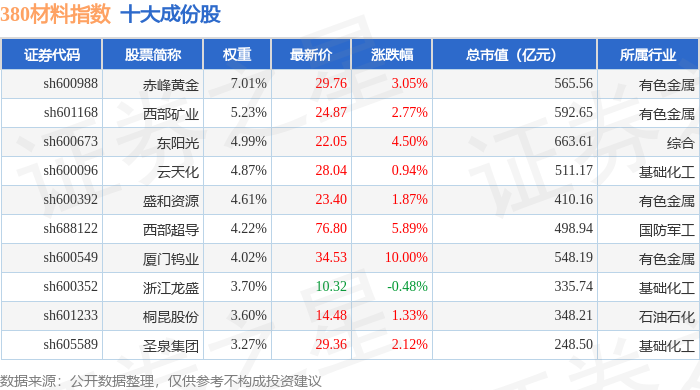 证券之星消息,10月27日,380材料(000105)指数报收于5022.34点,涨2.04%,成交296.15亿元,换手率1.84%。当日该指数成份股中,上涨的有34家,厦门钨业以10.0%的涨幅领涨,下跌的有13家,豫光金铅以4.22%的跌幅领跌。