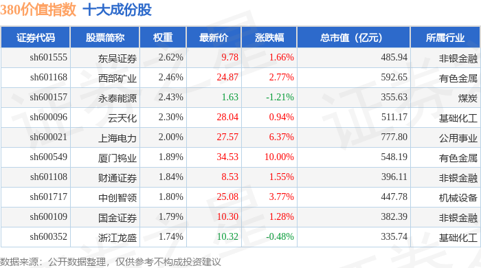 证券之星消息,10月27日,380价值(000118)指数报收于10121.77点,涨0.96%,成交505.75亿元,换手率1.58%。当日该指数成份股中,上涨的有70家,厦门钨业以10.0%的涨幅领涨,下跌的有48家,骆驼股份以6.02%的跌幅领跌。