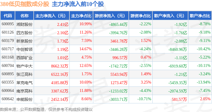 资金流向方面,380低贝(000138)指数成份股当日主力资金净流入合计3.97亿元,游资资金净流入合计9401.15万元,散户资金净流出合计4.91亿元。成份股资金流向详情见下表: